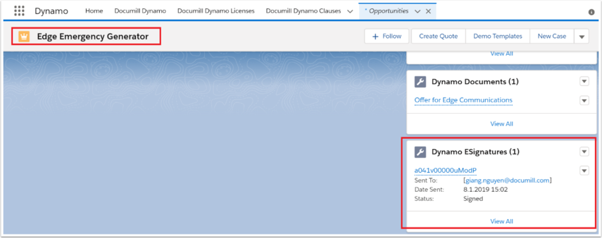 storeESignature, getDocuSignDocument, and getDocuSignStatus – These commands are used with the ‘DocuSign webhook’ integration (Salesforce and DocuSign implementing guide here) to get the status of the signing process and the final signed document stored under the Salesforce record (screenshot below).