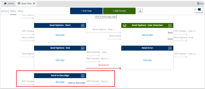The logic related to the DocuSign integration that has been added to the example template’s Main Flow are: