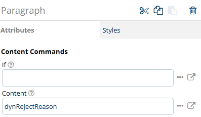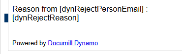 When creating a custom Rejection email, the rejection reason needs to be manually added to the template body. To do so, assign the content dynRejectReason to a paragraph or span.