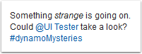 Something <i>strange</i> is going on.<p>Could @[${userID}] take a look?</p> #dynamoMysteries