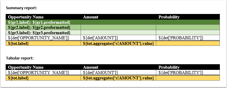 As can be seen, the structure of these tables is otherwise the same, except that the Summary table has three additional rows for its three levels of grouping (the rows of varying shades of green). The other three rows present in both tables are the header (black row), the details row (white row), and the grand totals (yellow row). While inline EL expressions have been used in this example, it is also possible to use the out command to print out the values.