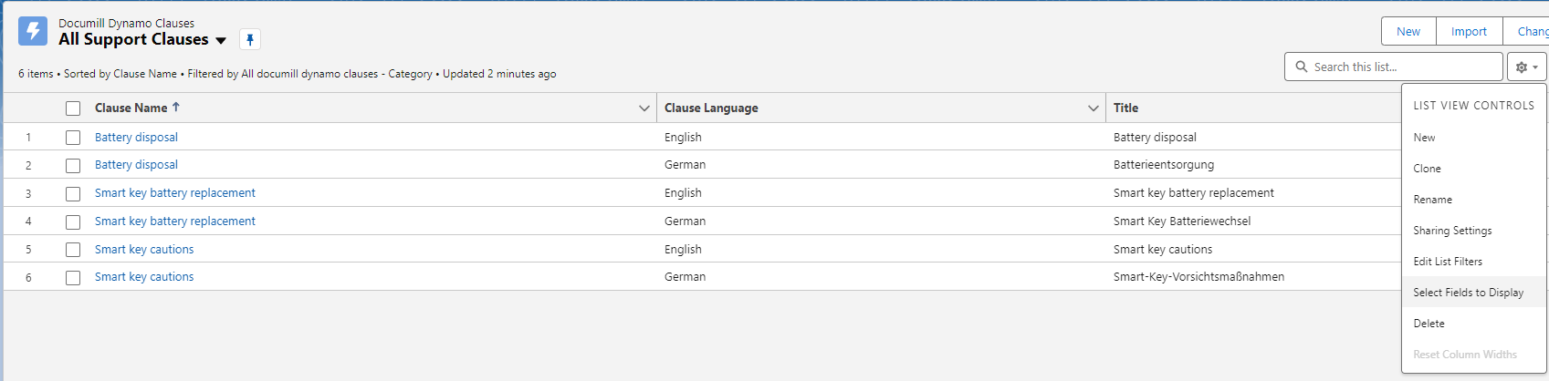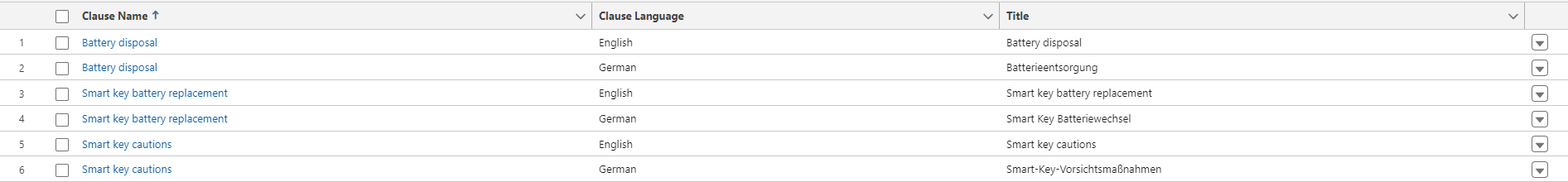 The example Clause list above uses a custom list view. It is recommended to create a similar list view that displays all the relevant clause information such as Language and Title. This makes maintaining the Clauses easier.