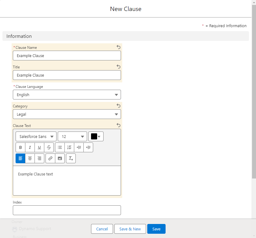 The Clause object has a number of pre-defined fields such as: Name, Title, Language, Category, Subcategory and Clause Text. Additional custom fields can be added from the Object Manager in the Salesforce setup. From the Object Manager, search for Dynamo Clause (dynamo__Clause__c), navigate to Fields & Relationships and click on the “New” button to add a new custom field.