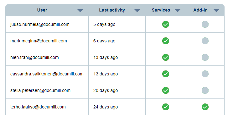 An administrator can reassign available licenses by activating or deactivating licenses for specific users. To revoke a license from a user, simply click on the green circle; conversely, to assign a license, click on the gray circle. A user will be listed in the license manager only after making at least one attempt to use Documill services. Without a valid license (indicated by a green circle), users will be unable to generate documents using Documill.