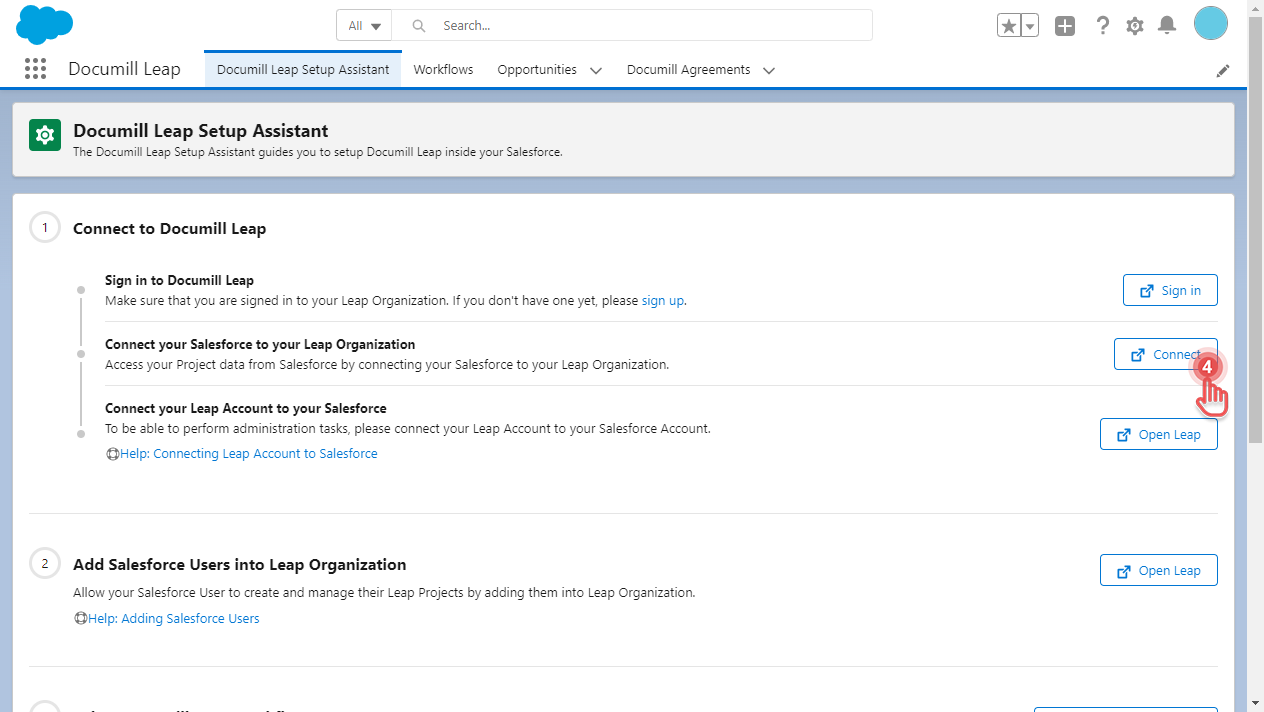The first step when setting up Documill Leap Salesforce app is to connect it to your Leap Organization: