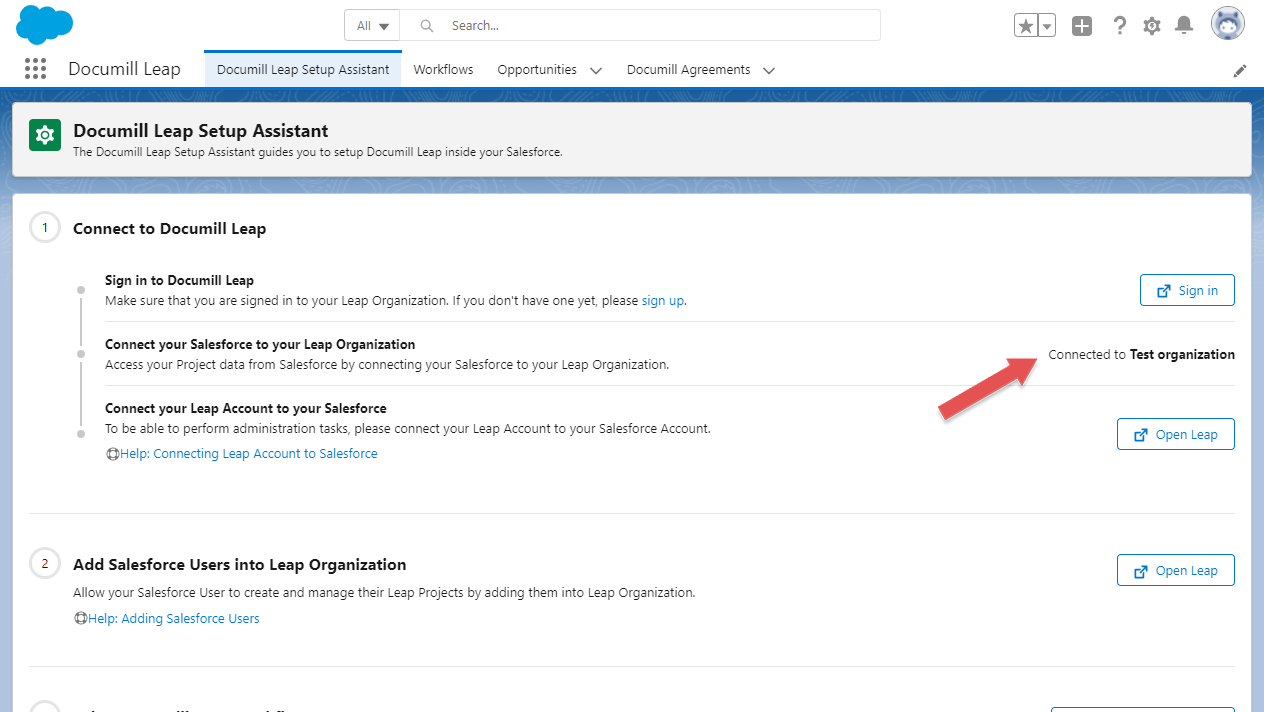 6. Documill Leap Setup Assistant now indicates that Documill Leap Salesforce app is connected to your Leap Organization.