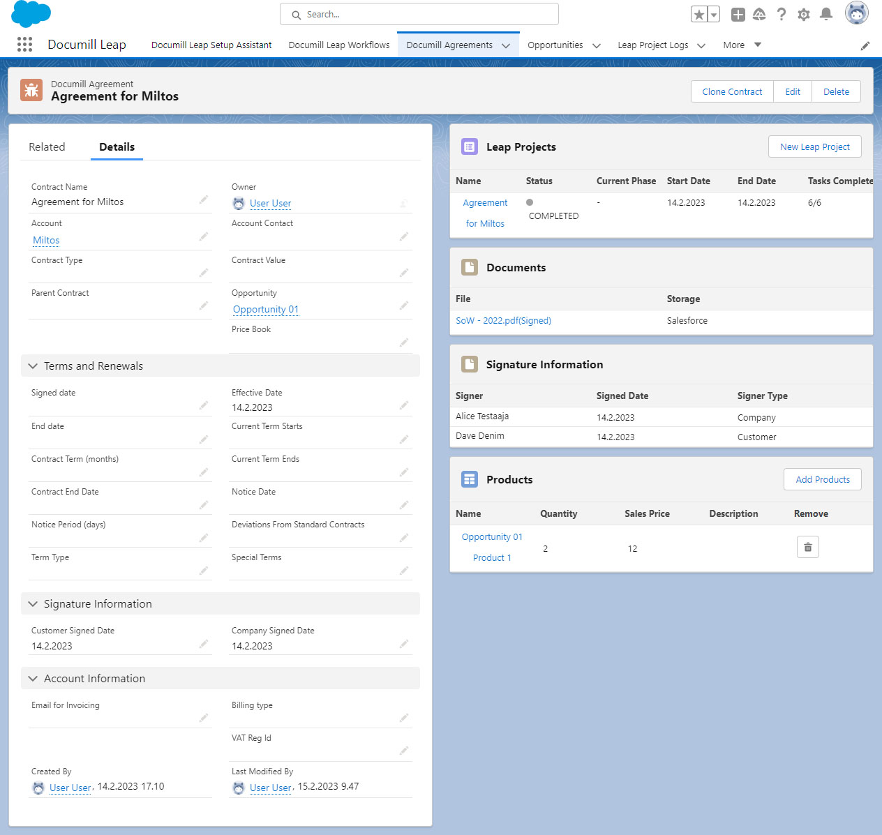 Documill Agreements is a custom Salesforce Object that is included in the Documill Leap Salesforce app. To know more about how to use Documill Agreements, please refer to: Working on a Documill Agreement