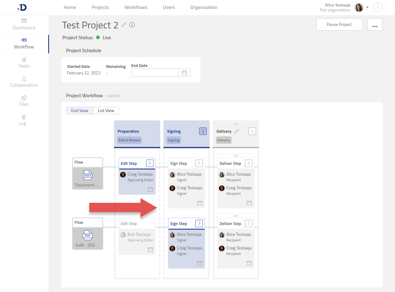 If there is more than one File in a Project Workflow, all Files are processed synchronously. By default, the File pass together option is enabled. This means that if the Steps for one File have already been completed and the other File still has incomplete Steps, the completed document will not move on to the next Phase. What this looks like in practice can be seen in the screenshot below.