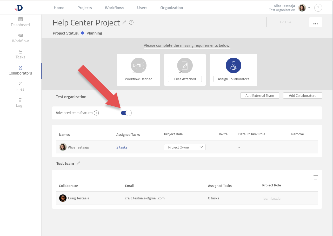 The Project Owner can enable the ‘Advanced team features’ option when an External team is involved in a Project. This option can be enabled while a Project status is set to Planning.