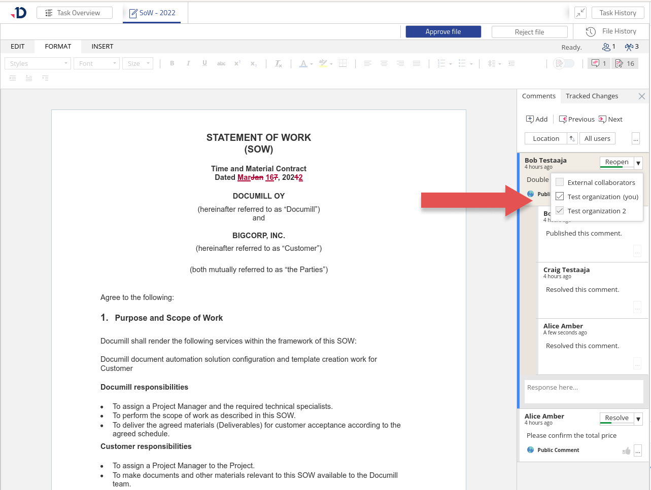 Enabling the Advanced team feature allows you to set the audience for each comment: either just your own team, or everyone (public comment). By default, if Advanced team feature is enabled, the newly added document comments are Team comments and are only visible to members of the same team. Changing a Team comment to Public allows all teams to view the comment and subsequently vote to resolve the comment.