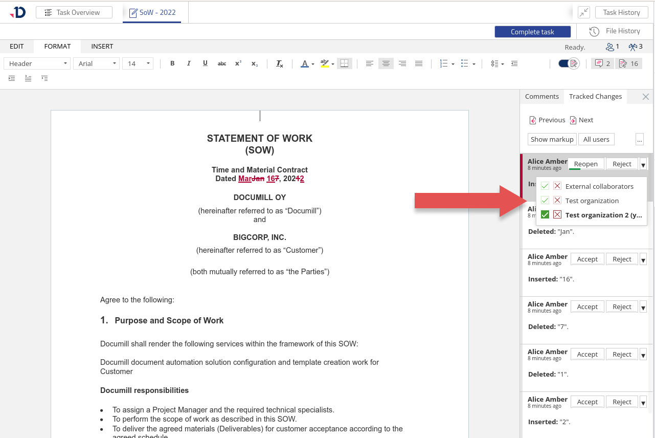 The Advanced team feature enables voting on tracked changes as well. The teams involved in a Project must come to an agreement on how to resolve each particular change. Any of the Collaborators with the appropriate task role, one which allows accepting/rejecting changes, can give a ‘vote’ on behalf of a team. Until quorum is reached, the ‘tracked change’ would remain unresolved.