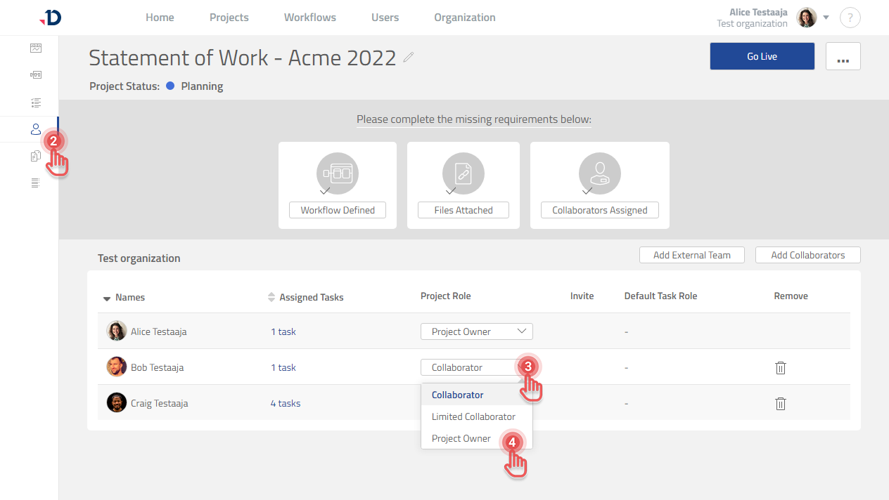 3. Click the Project Role dropdown of the Collaborator you would like to modify.