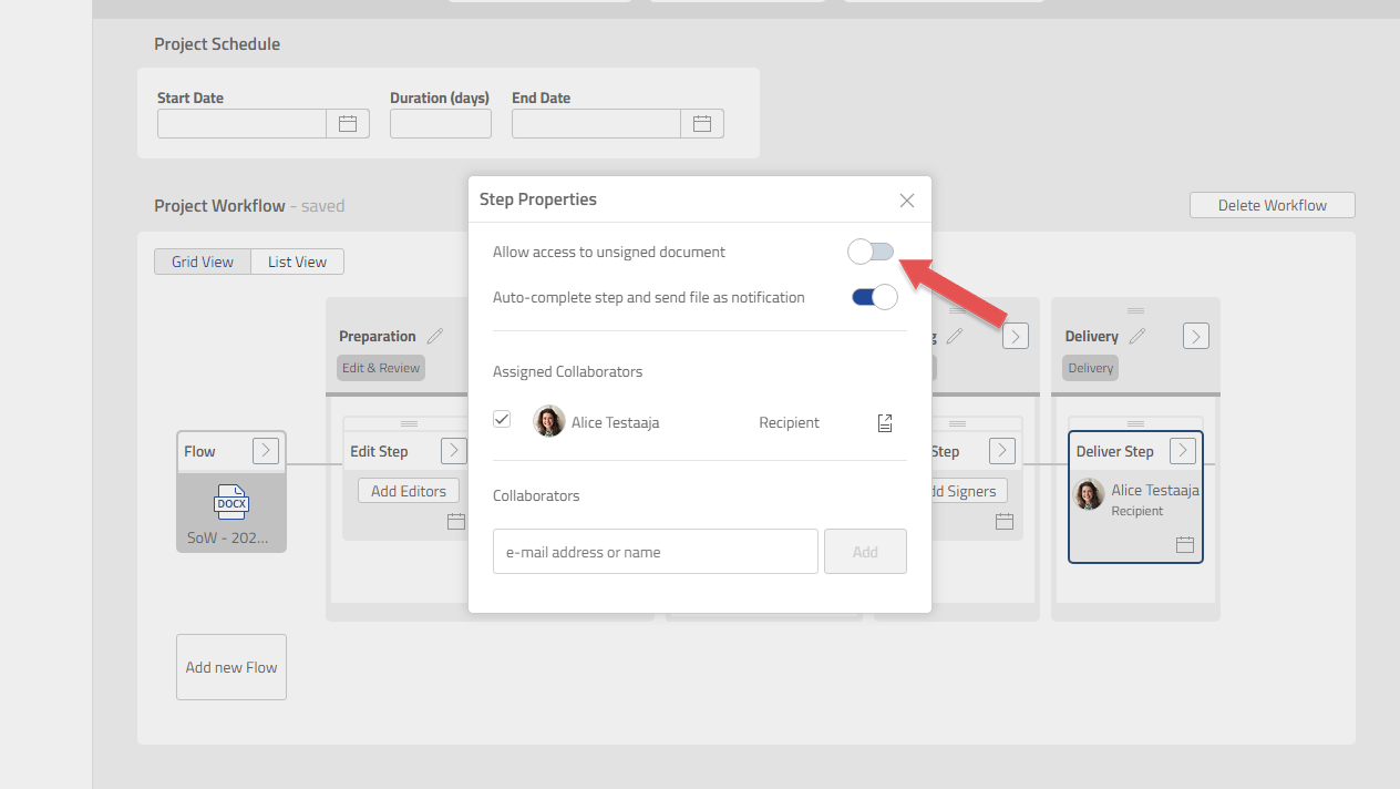 By default, the final version of the document will be sent out to Recipients via task notification e-mail. This will also automatically mark their Tasks and the Delivery Step as Completed. If you need to enforce Recipients to retrieve the final document from Leap, you can do that by disabling this option: