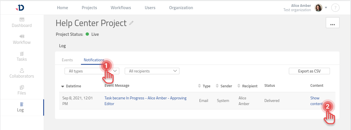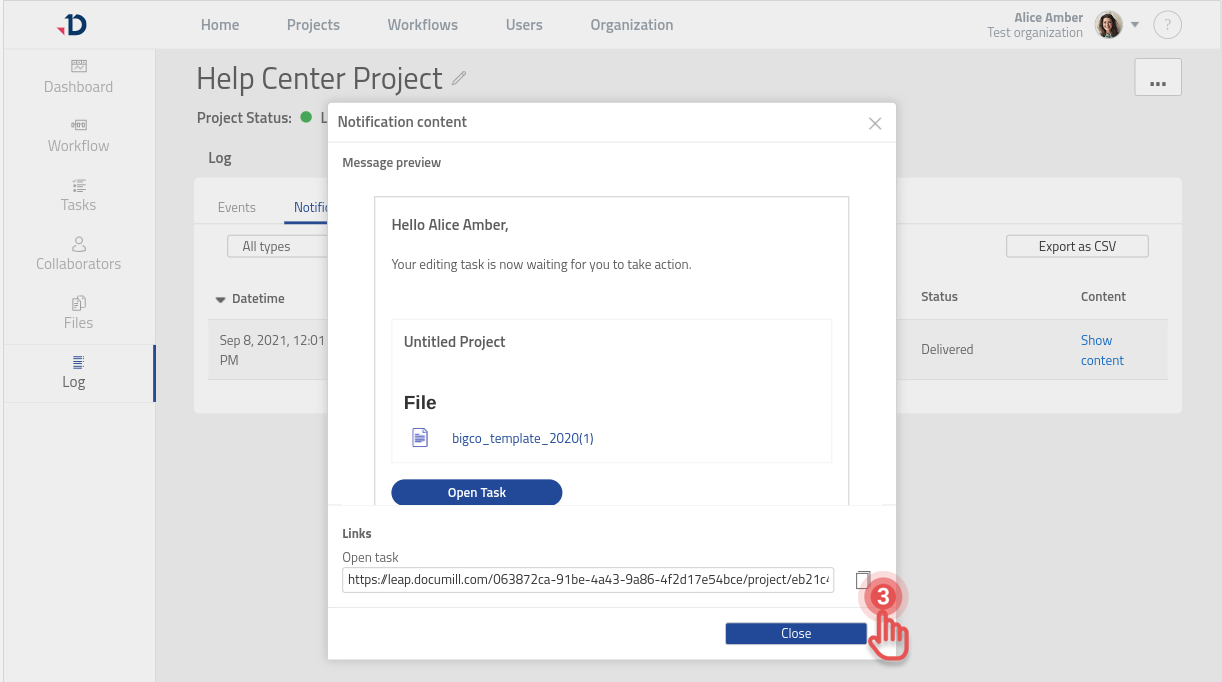 As the Project Owner, you can check the Notification log page to verify the status of the email notification. If an email notification was not sent, you can check the reason for the failure by clicking [Open Error] button.