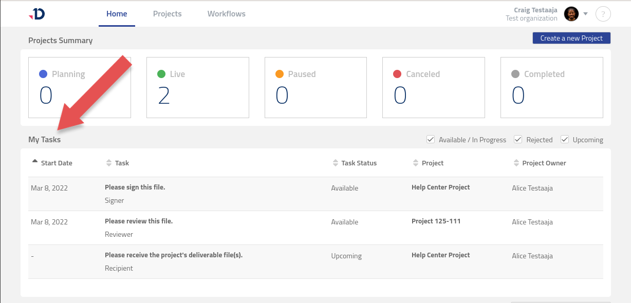 If you are a registered user, you can access your assigned Tasks from the Home page. The My Tasks table contains available and upcoming Tasks from Live Project in your Organization.
