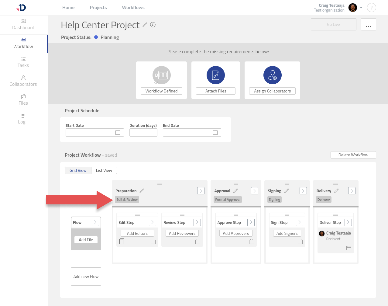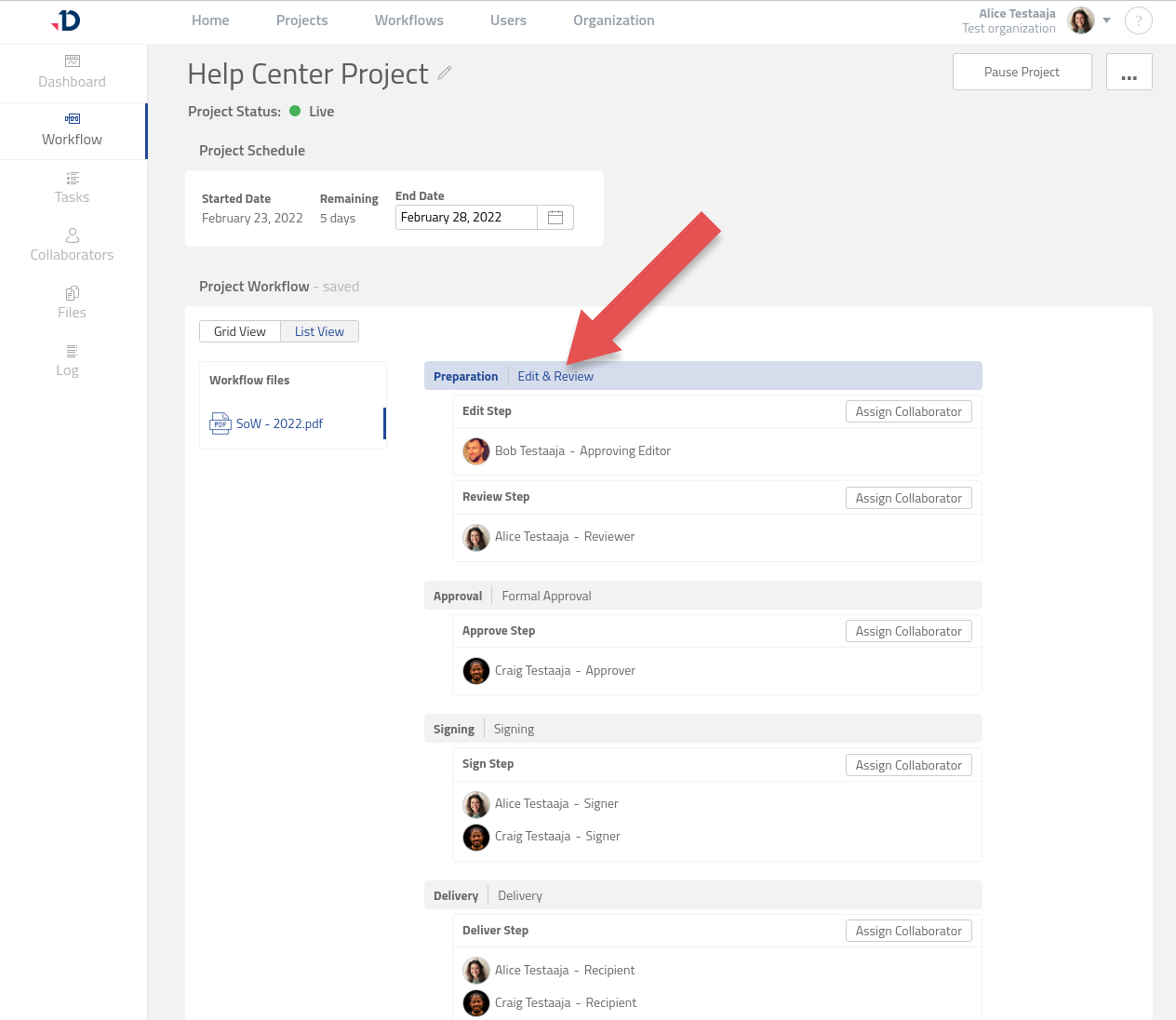 Edit & Review | This Phase can contain two types of steps - "Edit" and "Review".The type of the Step defines what a Collaborator can do to the document. This may be editing a document, commenting or reviewing it. |