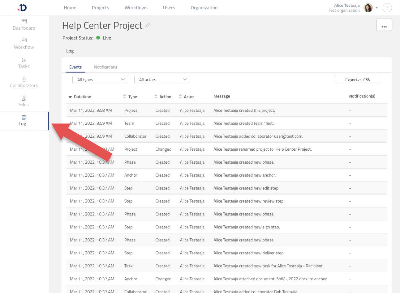 Project Log helps to audit activity that happened in a Project. You can access the Project Log by opening the Project and click the [Log] button.