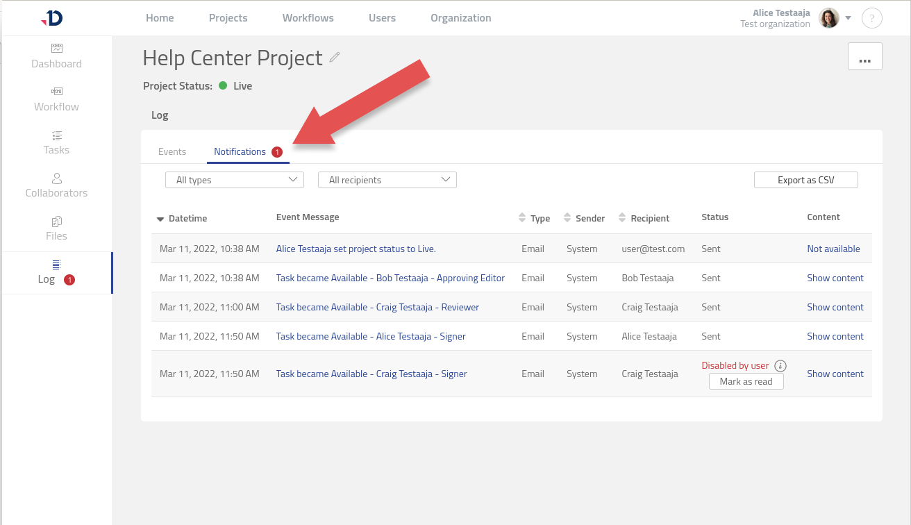 If an issue has occurred, the Project Log will also show a red dot indicator to notify you about the issue. For example, if a notification was not successfully sent, this will be marked with a red dot, describing the reason for the failure in the table.