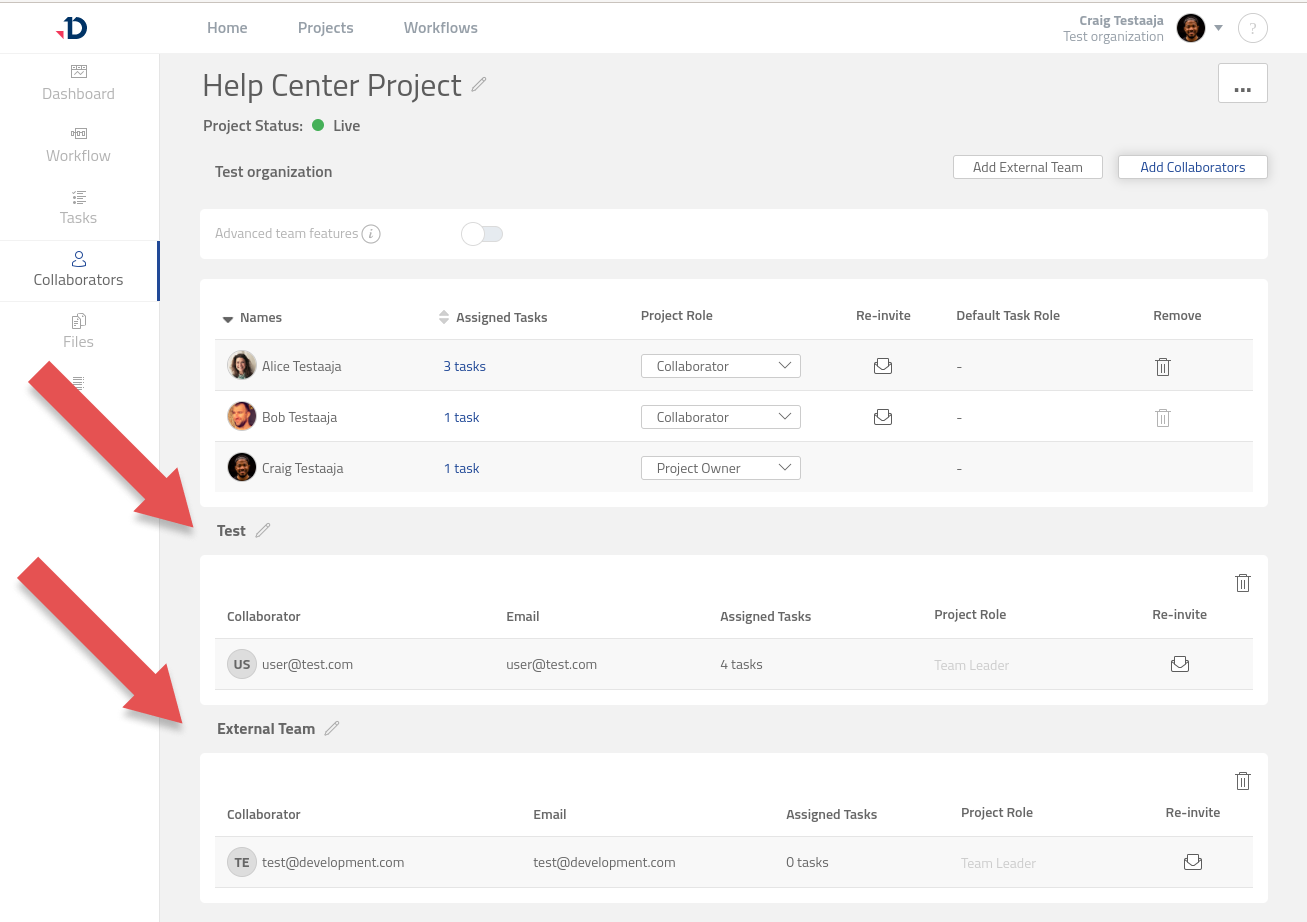 An External Team can also be assigned to an External Phase of the Project Workflow. The Team Leader will then be able to assign tasks to Collaborators within External Phase. The same Collaborator cannot be a member of two teams.