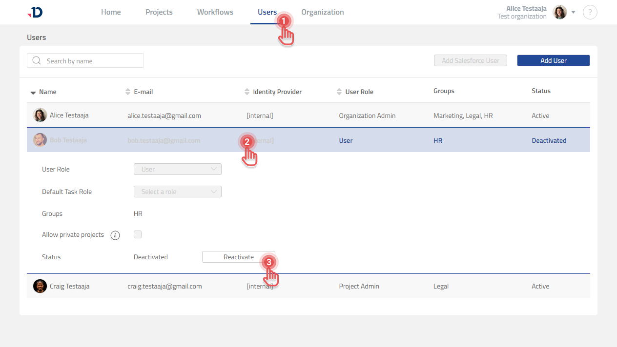 To reactivate a User who previously was deactivated:
