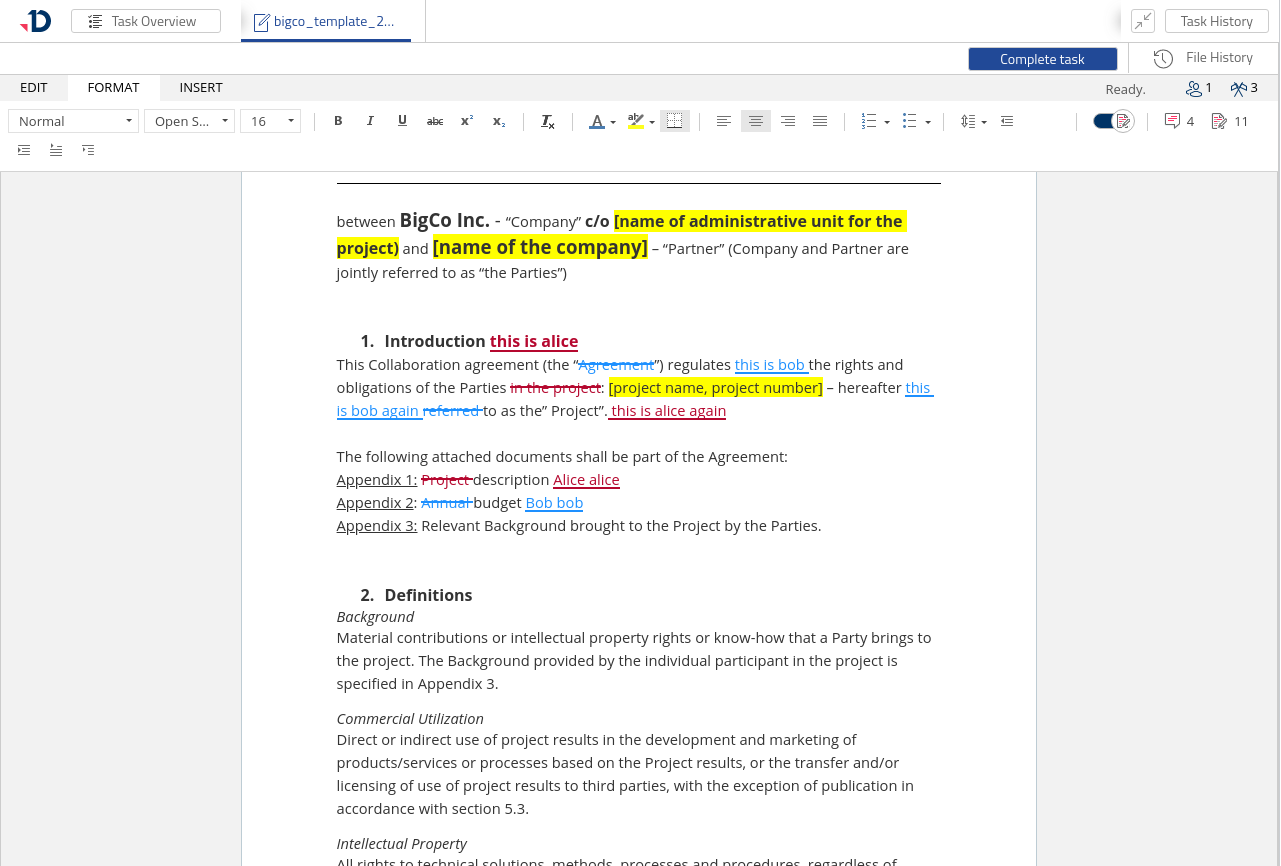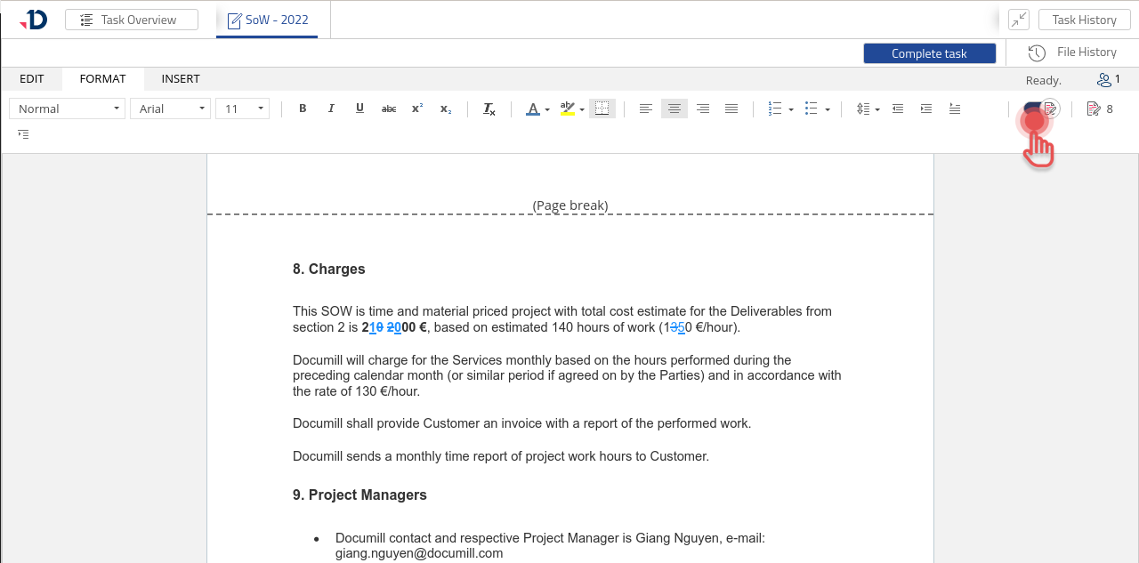 The enabled Track Changes mode makes visible changes made to the document by collaborators.