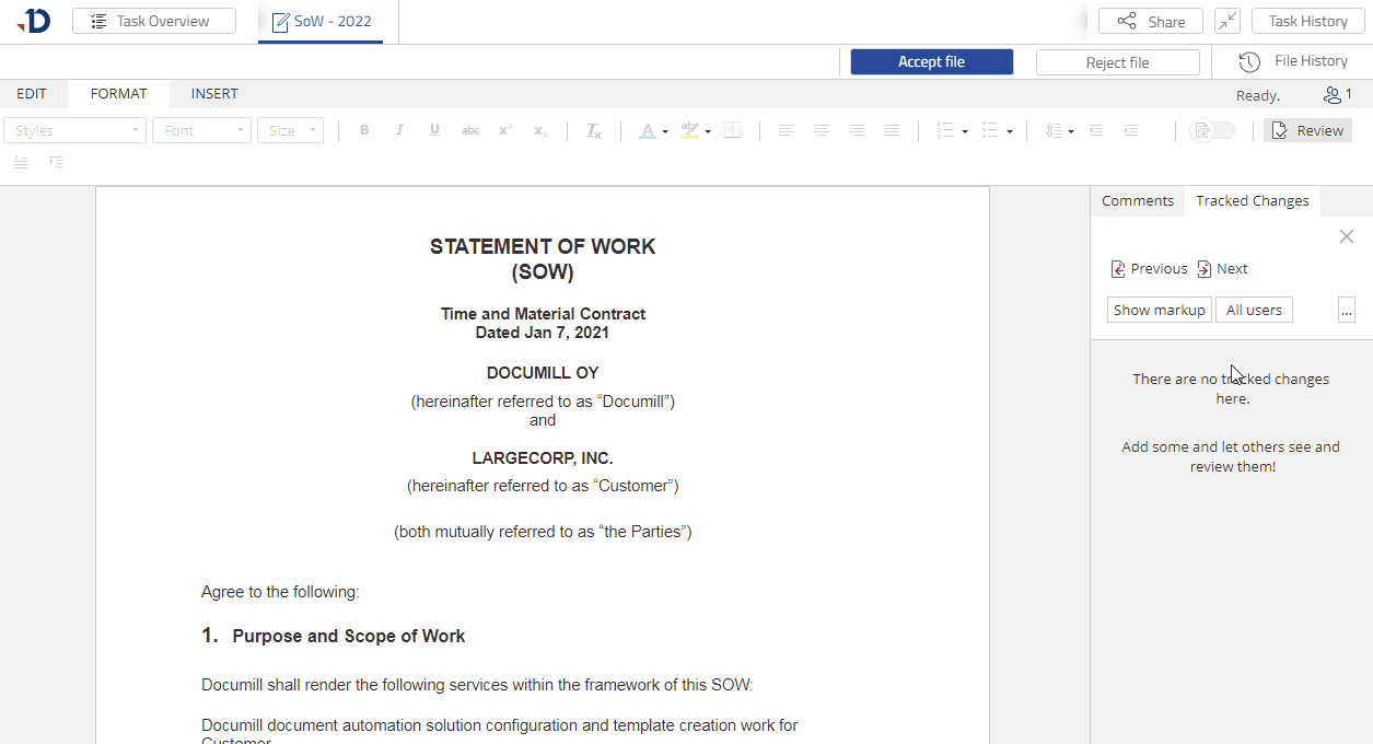 Notice the tracked changes in the document; tracked deletion is marked with strike-trough and tracked insertion is marked with underline.